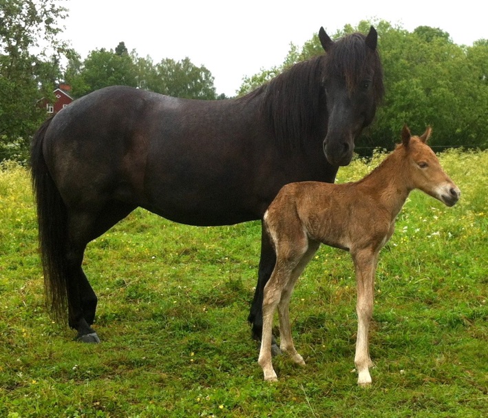 Med två svarta föräldrar var det väl inte precis en fux vi väntat oss, men både mormor Spes med täcket på bilden nedan och moster Frigga i mitten är ju fux, så så helt omöjligt var det ju inte. Långbent som en älgkalv.
